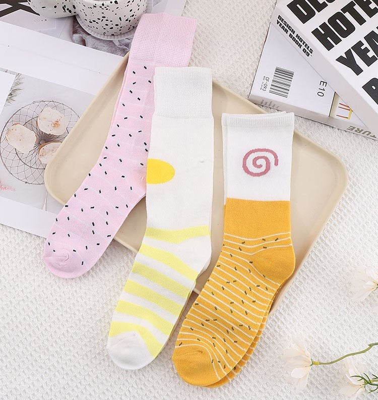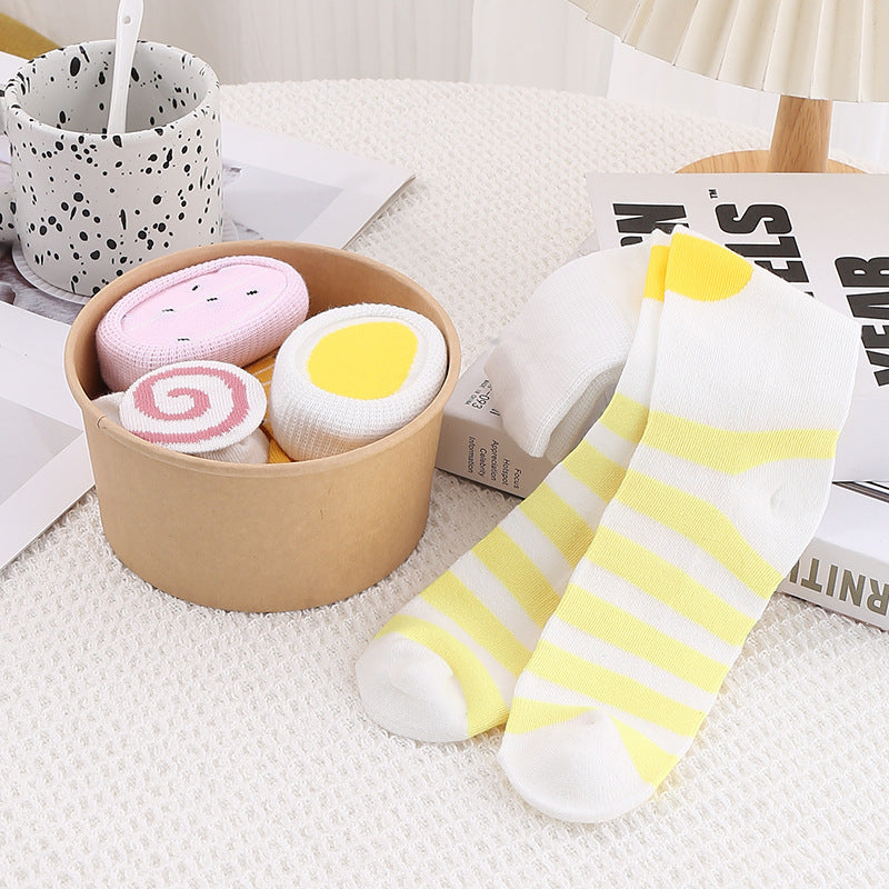 Söta novelty-strumpor med stekt ägg, klubba och dessertdesigner i en vacker rund träask. Perfekt present för frukostälskare!