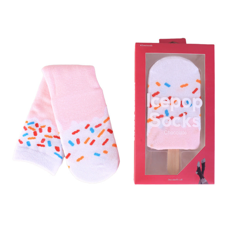 Söta rosa glasspinne-strumpor med regnbågsströssel i en vacker premium presentask. Perfekt liten present för glassälskare!