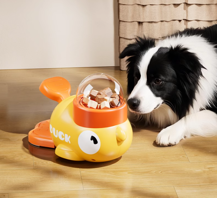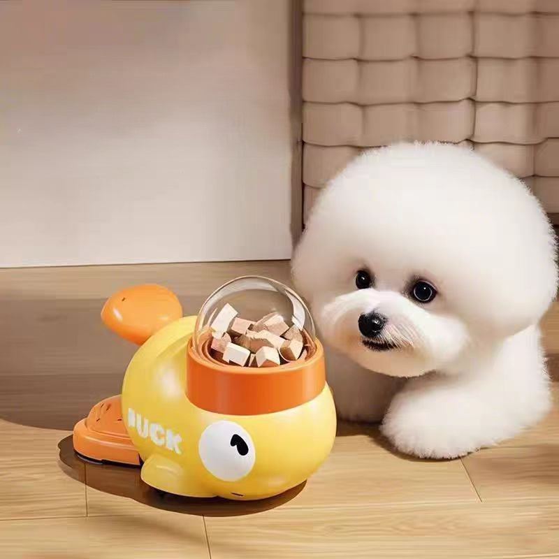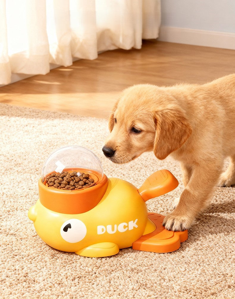 Låt ditt husdjur jobba för sina godbitar! Denna smarta anka-formade matdispenser tränar ditt husdjur att trycka för att få mat - roligt, stimulerande och belönande!