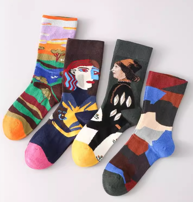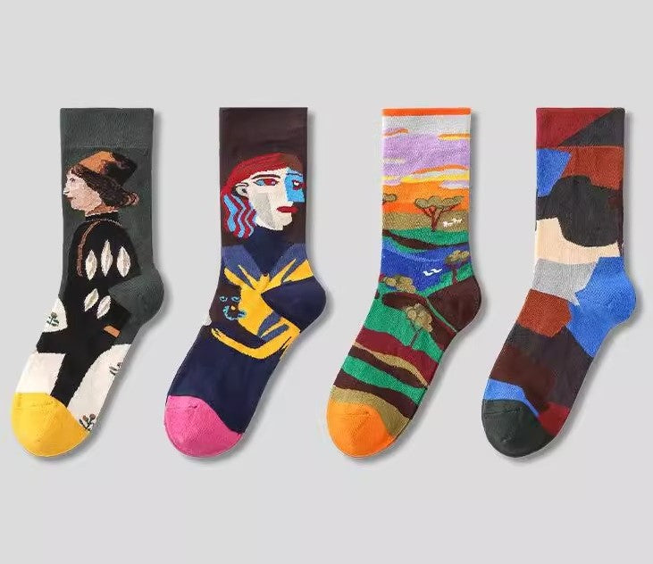 Fantastiska konstnärliga strumpor med berömda målningsinspirerade designer. Asymmetrisk AB-stil med olika mönster på varje strumpa för en unik fransk vintage-estetik.
